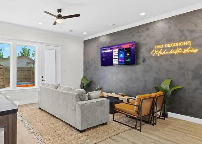 La Villa Downtown Luxe Retreat - King Bed, Pool, Pong, Billiards, Grill & Free Coffee dispone de lavaplatos, tetera y nevera en la cocina bien equipada. Los huéspedes pueden cenar en el restaurante East End Hardware, situado a tan solo 1 km. Se puede llegar al aeropuerto William P. Hobby en 22 minutos en coche desde el establecimiento. En la villa hay una piscina privada disponible todos los días, así como acceso a zona de pícnic, zona de juegos y mesa de billar.